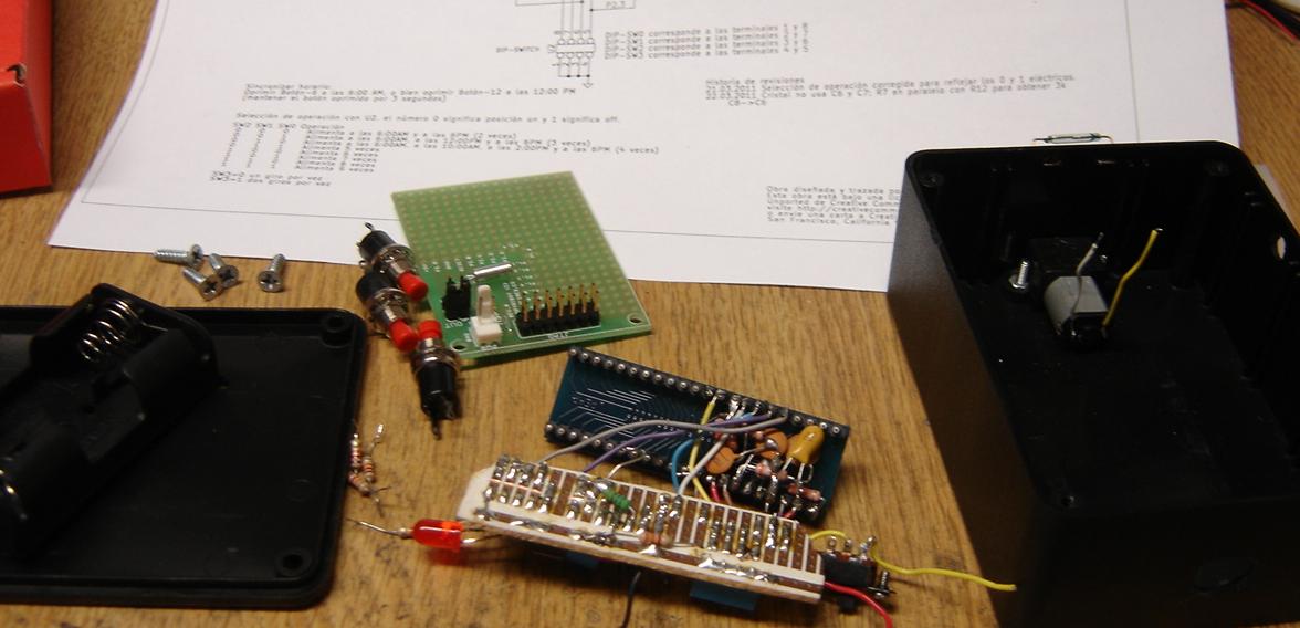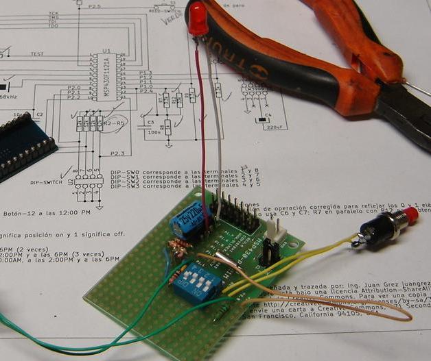 Prototipo anterior fuera de la caja para reusar varios componentes, y en segundo plano, tarjeta de MSP430F1121A.