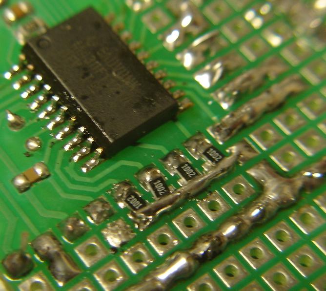 Los resistores indicados como 12k (R2-R5), en este caso, se usan del tipo SMD para ahorrar espacio, y se usan de 10k porque son las que hay a la mano y no alteran el funcionamiento ya que son usadas como «pull-up» y están habilitadas una pequeña porción del tiempo. En la siguiente figura se aprecia su montaje.