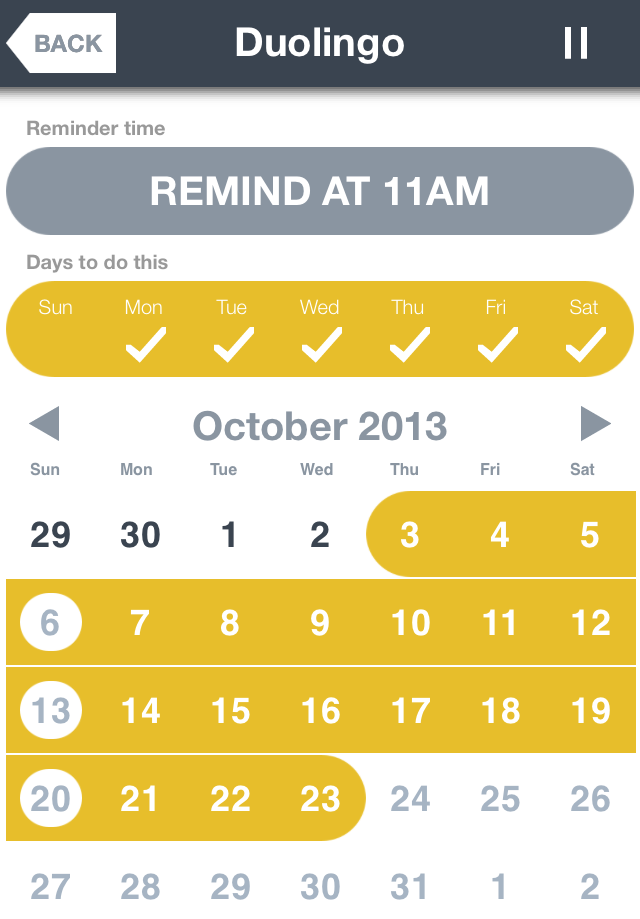 ¿Cómo la usas? Creas el hábito, seleccionas qué día descansar del hábito si lo consideras necesario, seleccionas el horario del aviso y empiezas a marcar los días que si cumples con el objetivo marcado, por ejemplo: Terminar una lección de Duolingo. La clave es no iniciar con objetivos demasiado exigentes, sino con metas alcanzables en un periodo corto, de 5 a 10 minutos de esfuerzo, una vez que obtienes el hábito con un mes de práctica, puedes empezar a incrementar el objetivo diario, tú mismo te darás cuenta si el incremento es demasiado para ti viendo tus estadísticas, y entonces procedes a bajar el objetivo para que vuelva a ser alcanzable.